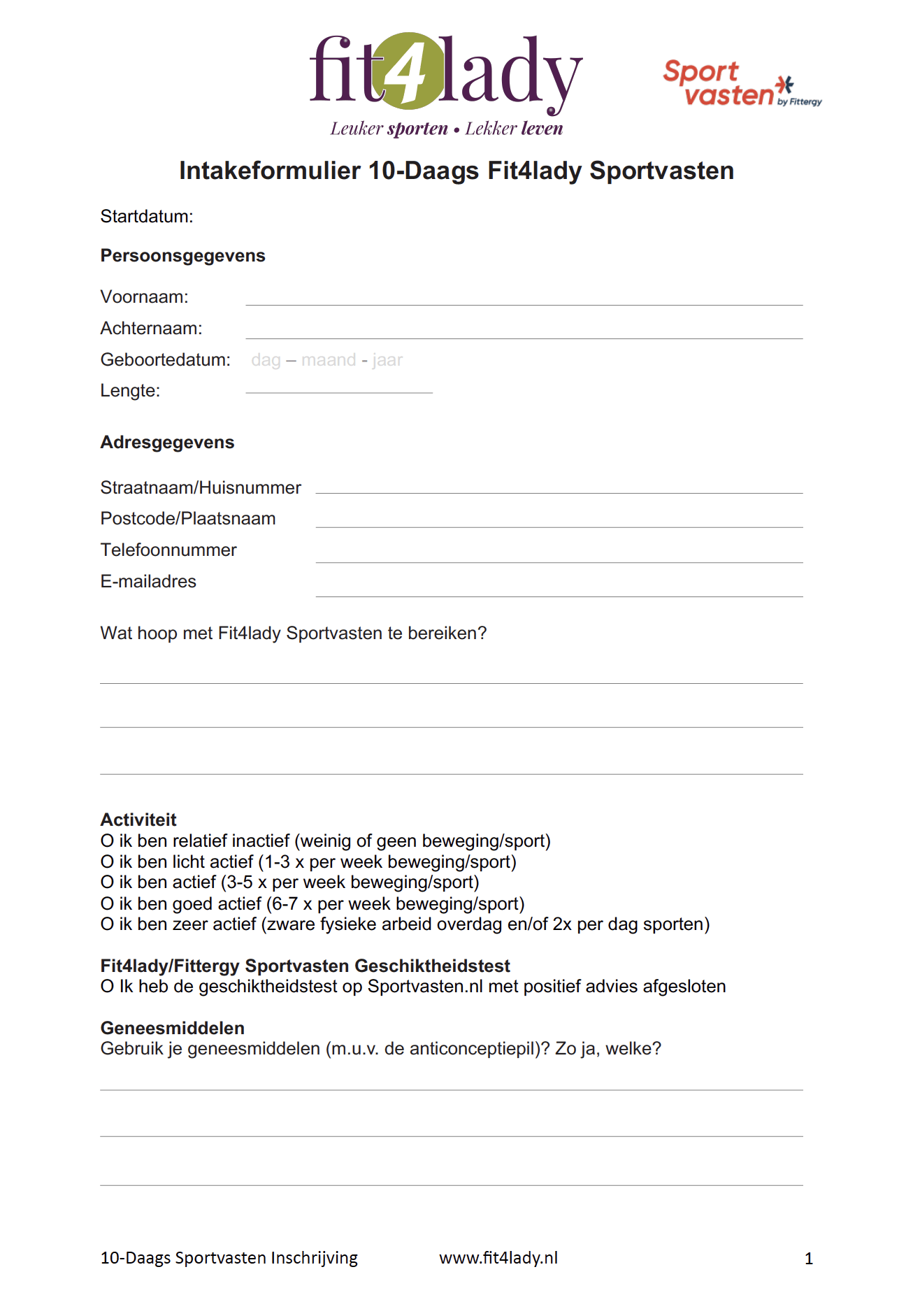 Download hier het intake formulier voor het 10 DaagsFit4lady Sportvasten. Volgend jaar gaan we dit ook digitaliseren in Logifit. Voor nu kun je met deze PDF werken.