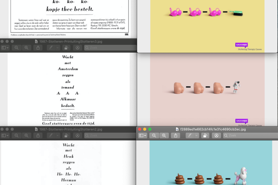 De beeldcampagne komt uit een Angelsaksisch land en had even goed voor ‘begrip voor stotteraars’ als voor ‘antistottercursussen’ ingezet kunnen worden. Kortom: beide campagnes doen hun werk. Als ik opdrachtgever zou zijn heb ik nog wel even nodig om een keuze te maken.